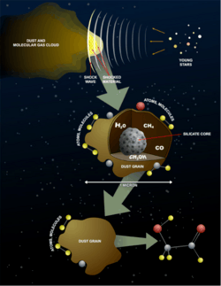 - ^ Öberg, K. I.; Garrod, R. T.; van Dishoeck, E. F.; Linnartz, H. (September 2009). "Formation rates of complex organics in UV irradiation CH_3OH-rich ices. I. Experiments". Astronomy and Astrophysics. 504 (3): 891–913. arXiv:0908.1169. Bibcode:2009A&A...504..891O. doi:10.1051/0004-6361/200912559. S2CID 7746611.