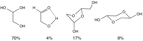 Glycolaldehyde as a gas is a simple monomeric structure. As a solid and molten liquid, it exists as a dimer. Collins and George reported the equilibrium of glycolaldehyde in water by using NMR.[2][3] In aqueous solution, it exists as a mixture of at least four species, which rapidly interconvert.[4]
