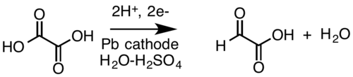 For the historical record, glyoxylic acid was prepared from oxalic acid electrosynthetically:[10][11] in organic synthesis, lead cathodes were applied for preparing glyoxylic acid from oxalic acid in a sulfuric acid electrolyte.[12]