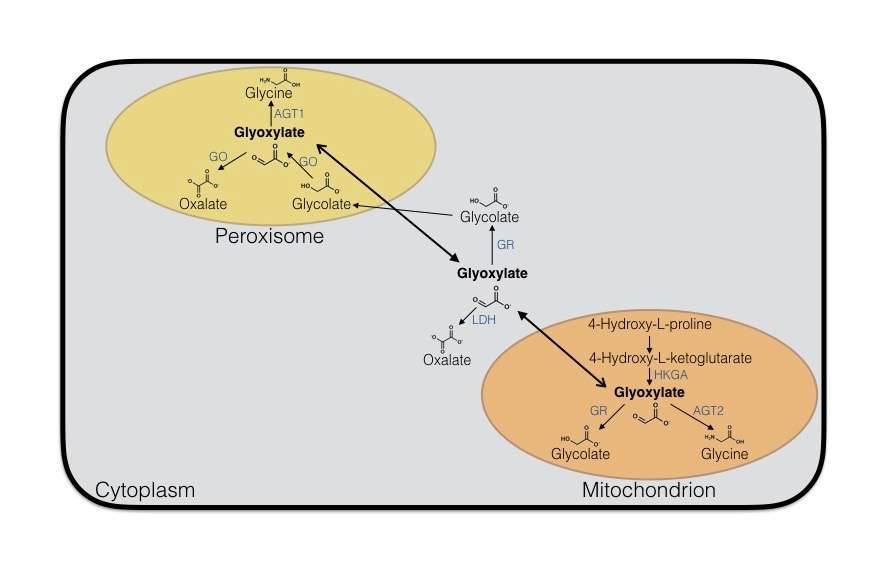 Glyoxylate is produced via two pathways: through the oxidation of glycolate in peroxisomes or through the catabolism of hydroxyproline in mitochondria.[17] In the peroxisomes, glyoxylate is converted into glycine by AGT1 or into oxalate by glycolate oxidase. In the mitochondria, glyoxylate is converted into glycine by AGT2 or into glycolate by glyoxylate reductase. A small amount of glyoxylate is converted into oxalate by cytoplasmic lactate dehydrogenase.[18]