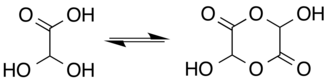 The structure of glyoxylic acid is shown as having an aldehyde functional group. The aldehyde is only a minor component of the form most prevalent in some situations. Instead, glyoxylic acid often exists as a hydrate or a cyclic dimer. For example, in the presence of water, the carbonyl rapidly converts to a geminal diol (described as the "monohydrate"). The equilibrium constant (K) is 300 for the formation of dihydroxyacetic acid at room temperature:[5] Dihydroxyacetic acid has been characterized by X-ray crystallography.[6]