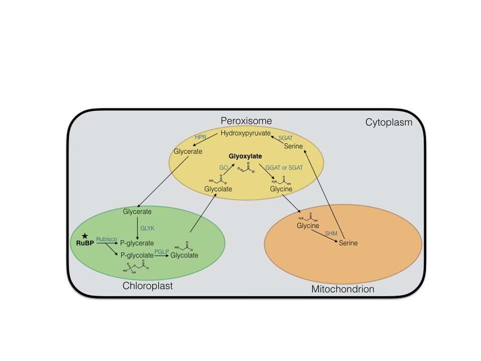 In addition to being an intermediate in the glyoxylate cycle, glyoxylate is also an important intermediate in the photorespiration pathway. Photorespiration is a result of the side reaction of RuBisCO with O2 instead of CO2. While at first considered a waste of energy and resources, photorespiration has been shown to be an important method of regenerating carbon and CO2, removing toxic phosphoglycolate, and initiating defense mechanisms.[19][20] In photorespiration, glyoxylate is converted from glycolate through the activity of glycolate oxidase in the peroxisome. It is then converted into glycine through parallel actions by SGAT and GGAT, which is then transported into the mitochondria.[21][20] It has also been reported that the pyruvate dehydrogenase complex may play a role in glycolate and glyoxylate metabolism.[22]