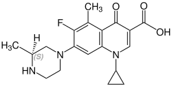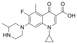 - ^ Hagen SE, Domagala JM, Heifetz CL, Johnson J (March 1991). "Synthesis and biological activity of 5-alkyl-1,7,8-trisubstituted-6-fluoroquinoline-3-carboxylic acids". Journal of Medicinal Chemistry. 34 (3): 1155–1161. doi:10.1021/jm00107a040. PMID 2002456.
