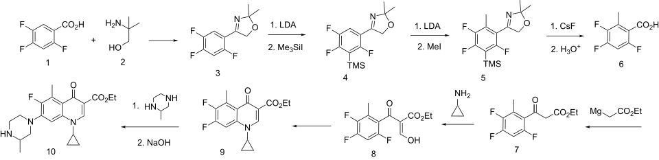 The scheme starts with the conversion of the carboxylic acid in (1) to its dimethyloxazoline derivative (3) by reaction with the aminomethyl propanol (2). Lithium diisopropylamide (LDA) then removes a proton from the 8 position; treatment of that anion with trimethylsilyl iodide leads to the silylated intermediate (4). A second round of LDA then generates a carbanion at the only open position; reaction with methyl iodide leads to the corresponding 5 methyl derivative (5). Treatment of that product with cesium fluoride breaks the carbon–silicon bond, removing the silyl group; aqueous acid then hydrolyzes the oxazoline to afford the free acid (6). This last intermediate is then taken on to the quinolone (9) [13] by essentially the same scheme as that used to prepare difloxacin, with the difference that the chain elongation is by means of Grignard reagent of ethyl bromoacetate. Treatment of (9) with 2-methylpiperazine proceeds by reaction at the less hindered of the two amino groups; saponification then affords grepafloxacin (10).