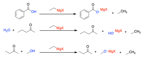 To prevent this, Grignard reactions are completed in an inert atmosphere to remove all water from the reaction flask and ensure that the desired product is formed.[13] Additionally, if there are acidic protons in the starting material, as shown in the figure on the right, one can overcome this by protecting the acidic site of the reactant by turning it into an ether or a silyl ether to eliminate the labile proton from the solution prior to the Grignard reaction.