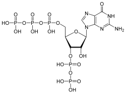 (p)ppGpp, guanosine pentaphosphate and tetraphosphate, also known as the "magic spot" nucleotides,[1] are alarmones involved in the stringent response in bacteria that cause the inhibition of RNA synthesis when there is a shortage of amino acids. This inhibition by (p)ppGpp decreases translation in the cell, conserving amino acids present. Furthermore, ppGpp and pppGpp cause the up-regulation of many other genes involved in stress response such as the genes for amino acid uptake (from surrounding media) and biosynthesis.[2] (p)ppGpp is also conserved in plants, where it is known to play a role in regulating growth and developmental processes.[3]