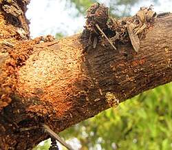 Gum arabic was defined by the 31st Codex Committee for Food Additives, held at The Hague from 19 to 23 March 1999, as the dried exudate from the trunks and branches of Acacia senegal or Vachellia (Acacia) seyal in the family Fabaceae (Leguminosae).[4]: 4 A 2017 safety re-evaluation by the Panel on Food Additives and Nutrient Sources of the European Food Safety Authority (EFSA) said that although the above definition holds true for most internationally traded samples, the term "gum arabic" does not indicate a particular botanical source; in a few cases, so‐called "gum arabic" may not even have been collected from Acacia (in the broad sense) species, instead coming from, e.g., Combretum or Albizia.[1]