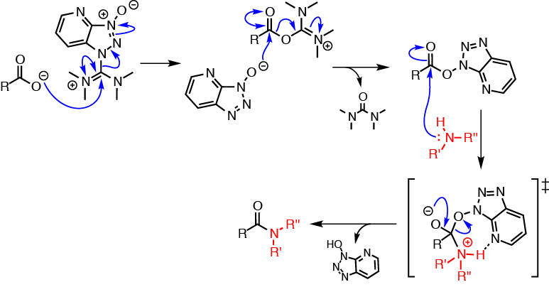 HATU is commonly encountered in amine acylation reactions (i.e., amide formation). Such reactions are typically performed in two distinct reaction steps: (1) reaction of a carboxylic acid with HATU to form the OAt-active ester; then (2) addition of the nucleophile (amine) to the active ester solution to afford the acylated product.