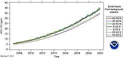 - ^ P. Forster; V. Ramaswamy; P. Artaxo; T. Berntsen; R. Betts; D.W. Fahey; J. Haywood; J. Lean; D.C. Lowe; G. Myhre; J. Nganga; R. Prinn; G. Raga; M. Schulz; R. Van Dorland (2007). "Chapter 2: Changes in Atmospheric Constituents and in Radiative Forcing". In Solomon, S.; Miller, H.L.; Tignor, M.; Averyt, K.B.; Marquis, M.; Chen, Z.; Manning, M.; Qin, D. (eds.). Climate Change 2007: The Physical Science Basis. Contribution of Working Group I to the Fourth Assessment Report of the Intergovernmental Panel on Climate Change. Cambridge, United Kingdom and New York, NY, USA: Cambridge University Press. Archived from the original on 1 December 2016. Retrieved 9 October 2016.