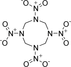 The molecular structure of HMX consists of an eight-membered ring of alternating carbon and nitrogen atoms, with a nitro group attached to each nitrogen atom. Because of its high mass-specific enthalpy of formation, it is one of the most potent chemical explosives manufactured, although a number of newer ones, including HNIW, TKX-50, and ONC, are more powerful.[2]