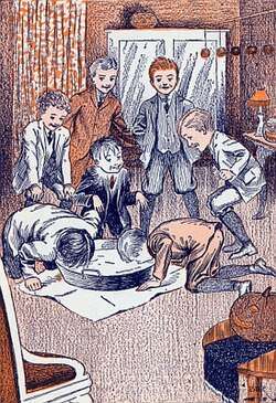 Several of the traditional activities from Ireland and Britain involve foretelling one's future partner or spouse. An apple would be peeled in one long strip, then the peel tossed over the shoulder. The peel is believed to land in the shape of the first letter of the future spouse's name.[212][213] Two hazelnuts would be roasted near a fire; one named for the person roasting them and the other for the person they desire. If the nuts jump away from the heat, it is a bad sign, but if the nuts roast quietly it foretells a good match.[214][215] A salty oatmeal bannock would be baked; the person would eat it in three bites and then go to bed in silence without anything to drink. This is said to result in a dream in which their future spouse offers them a drink to quench their thirst.[216] Unmarried women were told that if they sat in a darkened room and gazed into a mirror on Halloween night, the face of their future husband would appear in the mirror.[217] The custom was widespread enough to be commemorated on greeting cards[218] from the late 19th century and early 20th century.
