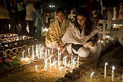 On All Saints' Day and All Souls' Day during the 19th century, candles were lit in homes in Ireland,[104] Flanders, Bavaria, and in Tyrol, where they were called "soul lights",[105] that served "to guide the souls back to visit their earthly homes".[106] Across Christendom, in preparation for Allhallowtide, Christians flocked to cemeteries "decorating the graves of their dear ones with flowers, tending the lawn, and spreading fresh white gravel around the tombs" with "candles, protected by little glass lanterns" being "placed around the graves or at the foot of the tombstones, to be lighted on All Saints' eve and left burning prior through the night."[107] The use of candles by Christians symbolized the light of Christ and the use of lamps at the tombs of Christian martyrs dates back to the early Christian period.[108][109]