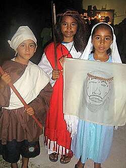 In 19th-century Spain at Allhallowtide, there was a procession in the city of San Sebastián to the city cemetery, an event that drew beggars who "appeal[ed] to the tender recollections of one's deceased relations and friends" for sympathy.[111] People in Spain continue to bake special pastries called "bones of the holy" (Spanish: huesos de santo) and set them on graves;[112] and at cemeteries in both Spain and France, as well as in Latin America, priests lead Christian processions and services during Allhallowtide, after which people keep an all-night vigil.[113]