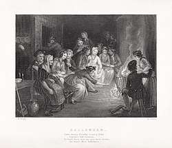 Samhain marked the end of the harvest season in autumn and beginning of winter or the 'darker half' of the year.[123][124] It was seen as a liminal time, when the boundary between this world and the Otherworld thinned. This meant the Aos Sí, the 'spirits' or 'fairies', could more easily come into this world and were particularly active.[125][126] Most scholars see them as "degraded versions of ancient gods [...] whose power remained active in the people's minds even after they had been officially replaced by later religious beliefs".[127] They were both respected and feared, with individuals often invoking the protection of God when approaching their dwellings.[128][129] At Samhain, the Aos Sí were appeased to ensure the people and livestock survived the winter. Offerings of food and drink, or portions of the crops, were left outside for them.[130][131][132] The souls of the dead were also said to revisit their homes seeking hospitality.[133] Places were set at the dinner table and by the fire to welcome them.[134] The belief that the souls of the dead return home on one night of the year and must be appeased seems to have ancient origins and is found in many cultures.[74] In 19th century Ireland, "candles would be lit and prayers formally offered for the souls of the dead. After this the eating, drinking, and games would begin".[135]