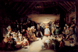 After 1605, Allhallowtide was eclipsed in England by Guy Fawkes Night (5 November), which appropriated some of its customs.[100] In England, the ending of official ceremonies related to the intercession of saints led to the development of new, unofficial Allhallowtide customs. In 18th- and 19th-century rural Lancashire, Catholic families gathered on hills on the night of All Hallows' Eve and one person held a bunch of burning straw on a pitchfork while the rest knelt around him, praying for the souls of relatives and friends until the flames went out. This was known as teen'lay.[101] There was a similar custom in Hertfordshire, and the lighting of "tindle" fires in Derbyshire.[102] Some suggested that these fires were originally lit to "guide the poor souls back to earth".[103] In Scotland and Ireland, old Allhallowtide customs that were at odds with Reformed teaching were not suppressed because they "were important to the life cycle and rites of passage of local communities" and so curbing them would have been difficult.[25]