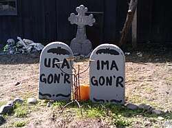The modern imagery of Halloween comes from many sources, including Christian eschatology, national customs, works of Gothic and horror literature (such as the novels Frankenstein; or, The Modern Prometheus and Dracula) and classic horror films such as Frankenstein (1931) and Night of the Living Dead (1968).[165][166] Imagery of the skull, a reference to Golgotha in the Christian tradition, serves as "a reminder of death and the transitory quality of human life" and is consequently found in memento mori and vanitas compositions;[167] skulls have therefore been commonplace in Halloween, which touches on this theme.[168] Traditionally, the back walls of churches are "decorated with a depiction of the Last Judgment, complete with graves opening and the dead rising, with a heaven filled with angels and a hell filled with devils", a motif that has permeated the observance of this triduum.[169] One of the earliest works on the subject of Halloween is from Scottish poet John Mayne, who, in 1780, made note of pranks at Halloween—"What fearfu' pranks ensue!", as well as the supernatural associated with the night, "bogles" (ghosts)[170]—influencing Robert Burns' "Halloween" (1785).[171] Elements of the autumn season, such as pumpkins, corn husks, autumn leaves, and scarecrows, are also prevalent. Homes are often decorated with these types of symbols around Halloween. Halloween imagery includes themes of death, evil, and mythical monsters.[172] Black cats, which have been long associated with witches, are also a common symbol of Halloween. Black, orange, and sometimes purple are Halloween's traditional colors.[173]