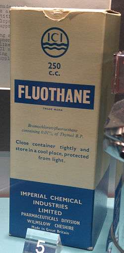Halothane (bromochlorotrifluoroethane), sold under the brand name Fluothane among others, is a halocarbon with the chemical formula CF3CHBrCl. It is used as a general anaesthetic given by inhalation. It can be used to induce or maintain anaesthesia.[5] Its use in developed countries has been mostly replaced by newer anesthetic agents such as sevoflurane.[6] One of its benefits is that it does not increase the production of saliva, which can be particularly useful in those who are difficult to intubate.[5]