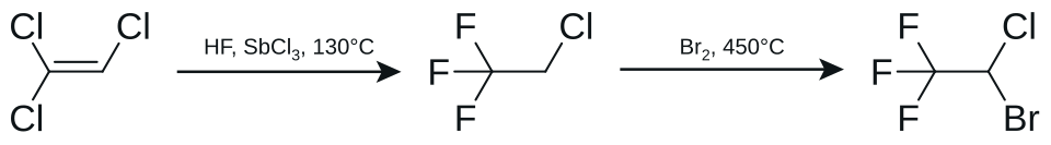 The commercial synthesis of halothane starts from trichloroethylene, which is reacted with hydrogen fluoride in the presence of antimony trichloride at 130 °C to form 2-chloro-1,1,1-trifluoroethane. This is then reacted with bromine at 450 °C to produce halothane.[35]