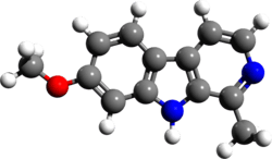 Harmine, also known as banisterine or telepathine, as well as 7-methoxyharman or 7-methoxy-1-methyl-β-carboline, is a β-carboline and a harmala alkaloid which has hallucinogenic effects and monoamine oxidase inhibitor (MAOI) activity.[10] It occurs in a number of different plants, most notably Peganum harmala and Banisteriopsis caapi.[11] Harmine reversibly inhibits monoamine oxidase A (MAO-A), an enzyme which breaks down monoamines, making it a reversible inhibitor of monoamine oxidase A (RIMA). Harmine does not inhibit MAO-B.[12]