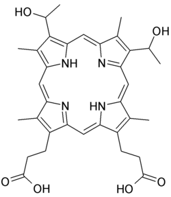 Hematoporphyrin (Photodyn, Sensibion) is a porphyrin prepared from hemin. It is a derivative of protoporphyrin IX, where the two vinyl groups have been hydrated (converted to alcohols). It is a deeply colored solid that is usually encountered as a solution. Its chemical structure was determined in 1900.[1]