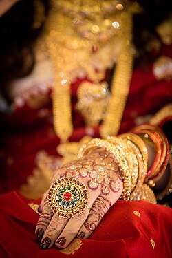 In Bangladesh, women use mehndi on hands on occasions like weddings and engagements as well as during Eid al-Fitr, Eid al-Adha and other events.[31] In wedding ceremonies, the Mehndi ceremony has traditionally been separated into two events: one organized by the bride's family and one by the groom's family. These two events are solely dedicated for adorning the bride and groom in Mehndi and is known as a 'Mehndi Shondha' meaning the Evening of Mehndi.
