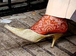 The bride is painted in henna mixed by her mother.[53] The mixture consists of rose water, eggs, cognac, salt, and shadab, believed to be a magical herb that repels evil.[53] The bride changes into a less elaborate outfit and incense is burned while she is painted with henna.[53] Then, another zavfa (procession) occurs as the bride returns to her party.[53]