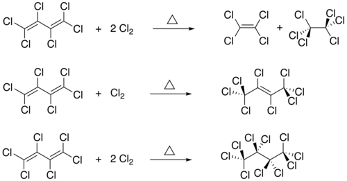 The products of chlorinolysis reactions heavily depend upon both the temperature and pressure under which the reaction occurs. Thus, by adjusting these reaction conditions in the presence of chlorine gas, hexachlorobutadiene can be even further chlorinated to give tetrachloroethylene, hexachloroethane, octachlorobutene, and even decachlorobutane. In general, increasing the number of chlorine substituents on a compound increases its toxicity but decreases its combustibility. Chlorination via carbon skeleton cleavage is thermodynamically preferred, whereas chlorinated C4 products are favored at lower temperatures and pressures. The three chlorinolysis products of hexachlorobutadiene are shown in the reactions below.[3]