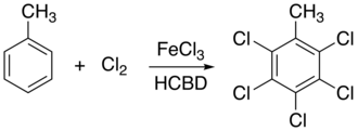 Just like chlorine, many other chlorine-containing compounds can be readily dissolved in a solution of hexachlorobutadiene. As a solvent, it is unreactive toward common acids and select non-nucleophilic bases. An illustrative application HCBD as a solvent is the FeCl3-catalyzed chlorination of toluene to give pentachloromethylbenzene. Hexachlorobutadiene is used exclusively over carbon tetrachloride in this reaction because ferric chloride (FeCl3) is insoluble in CCl4.[5][6]