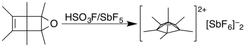 6, was produced by Hepke Hogeveen and Peter Kwant.[13] This can be done by dissolving the hexamethyl Dewar benzene monoepoxide in magic acid, which removes the oxygen as an anion.[14] NMR had previously hinted at a pentagonal pyramidal structure in a related cation[15] as had spectral data on the Hogeveen and Kwant dication.[16][17] The pyramidal structure having an apex carbon bonding to six other carbon atoms was confirmed by X-ray crystallographic analysis of the hexafluoroantimonate salt published in 2016.[14]