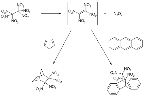 For the decomposition in solution, tetranitroethylene is first formed and can be trapped and detected as a Diels–Alder adduct, for example with anthracene or cyclopentadiene.[7][8]