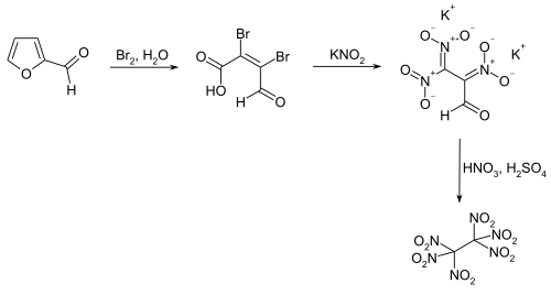 A practicable method for industrial use starts with furfural,[3] which first undergoes oxidative ring-opening by bromine to mucobromic acid.[4] In the following step, mucobromic acid is reacted with potassium nitrite at just below room temperature to form the dipotassium salt of 2,3,3-trinitropropanal. The final product is obtained by nitration with nitric acid and sulfuric acid at −60 °C.