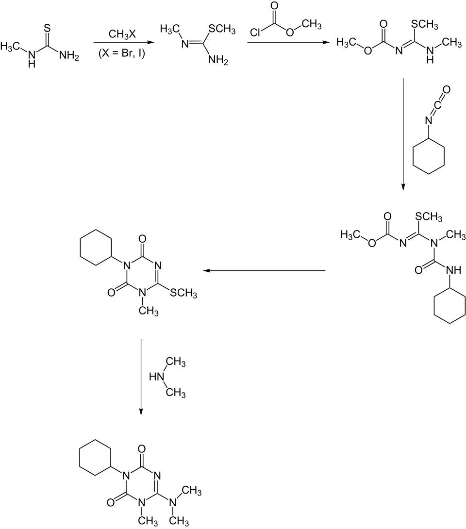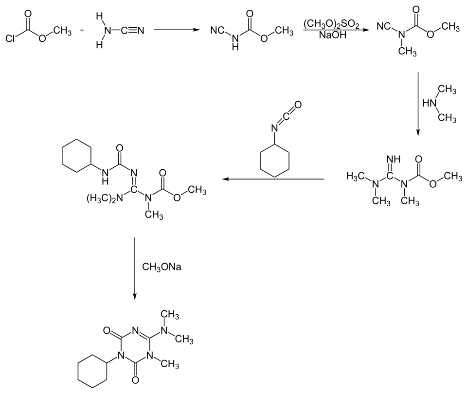 Hexazinone can be synthesized in two different reaction processes. One process starts with a reaction of methyl chloroformate with cyanamide, forming hexazinone after a five-step pathway:[8]