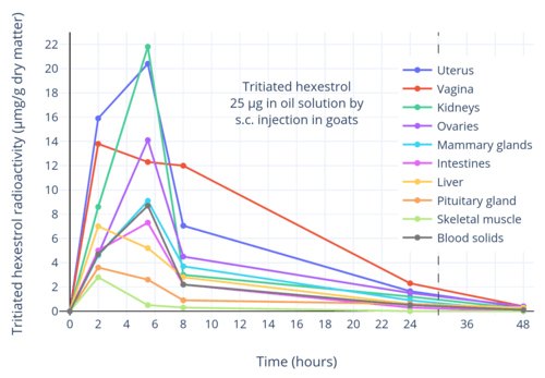 The pharmacokinetics and distribution of hexestrol have been studied with intravenous injection of aqueous solution in women and with subcutaneous injection of oil solution in female goats and sheep.[15][13]