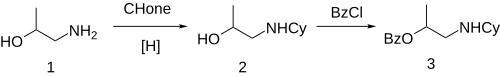 The reductive amination between 1-Amino-2-propanol [78-96-6] (1) and cyclohexanone gives 1-Cyclohexylamino-2-propanol [103-00-4] (2). Treatment with benzoyl chloride gives the ester, completing the synthesis of Hexylcaine (3).