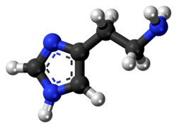 Histamine is an organic nitrogenous compound involved in local immune responses communication, as well as regulating physiological functions in the gut and acting as a neurotransmitter for the brain, spinal cord, and uterus.[3][4] Discovered in 1910, histamine has been considered a local hormone (autocoid) because it is produced without involvement of the classic endocrine glands; however, in recent years, histamine has been recognized as a central neurotransmitter.[5] Histamine is involved in the inflammatory response and has a central role as a mediator of itching.[6] As part of an immune response to foreign pathogens, histamine is produced by basophils and by mast cells found in nearby connective tissues. Histamine increases the permeability of the capillaries to white blood cells and some proteins, to allow them to engage pathogens in the infected tissues.[7] It consists of an imidazole ring attached to an ethylamine chain; under physiological conditions, the amino group of the side-chain is protonated.