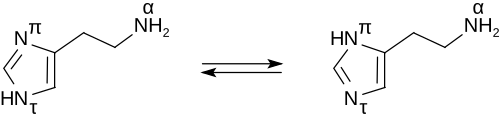 Histamine base, obtained as a mineral oil mull, melts at 83–84 °C (181–183 °F).[8] Hydrochloride[9] and phosphorus[10] salts form white hygroscopic crystals and are easily dissolved in water or ethanol, but not in ether. In aqueous solution, the imidazole ring of histamine exists in two tautomeric forms, identified by which of the two nitrogen atoms is protonated. The nitrogen farther away from the side chain is the 'tele' nitrogen and is denoted by a lowercase tau sign and the nitrogen closer to the side chain is the 'pros' nitrogen and is denoted by the pi sign. The tele tautomer, Nτ-H-histamine, is preferred in solution as compared to the pros tautomer, Nπ-H-histamine.