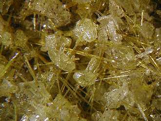 ![]() Yellow acicular crystals of hoelite (picture size: 10 mm) | |