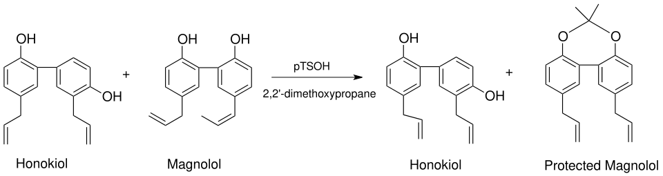 There are several methods for purifying and isolating honokiol. In nature, honokiol exists with its structural isomer magnolol, which differs from honokiol only by the position of one hydroxyl group. Because of the very similar properties of magnolol and honokiol, purification has often been limited to a HPLC or electromigration. However, methods developed in 2006 by workers in the lab of Jack L. Arbiser, took advantage of the proximity of the phenolic hydroxyl groups in magnolol, which form a protectable diol, to generate a magnolol acetonide (Figure 1), with a subsequent simple purification via flash chromatography over silica.[4]