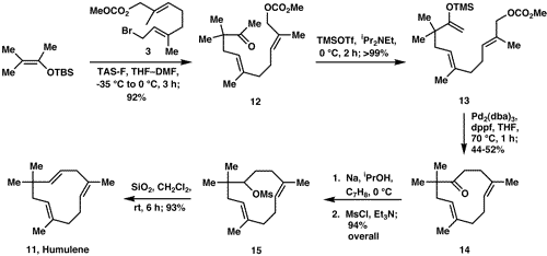 - ^ Hu, Tao & Corey, E.J. (2002). "Short Syntheses of (±)-δ-Araneosene and Humulene Utilizing a Combination of Four-Component Assembly and Palladium-Mediated Cyclization". Organic Letters. 4 (14): 2441–2443. doi:10.1021/ol026205p. PMID 12098267.