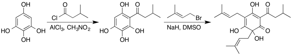 Humulone can be synthesized by the acylation of benzene-1,2,3,5-tetrol with isovaleryl chloride to give 2,3,4,6-tetrahydroxyisovalerophenone. This step is followed by prenylation with 1-bromo-3-methyl-2-butene to give humulone.[5]