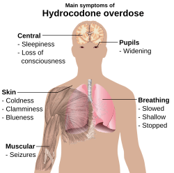 Symptoms of hydrocodone overdose include narrowed or widened pupils; slow, shallow, or stopped breathing; slowed or stopped heartbeat; cold, clammy, or blue skin; excessive sleepiness; loss of consciousness; seizures; or death.[36]