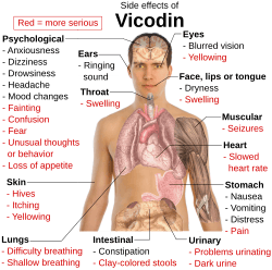 Hydrocodone: Respiratory depression, extreme somnolence progressing towards coma, muscle limpness, cold and clammy skin, slow heart rate, low blood pressure, abrupt loss of heart function, and death may occur.[2]