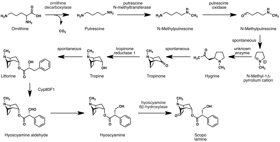 A generic presentation of the steps in the biosynthesis of hyoscine, adapted from the review of Ziegler and Facchini, is illustrated below.[18] It begins with the decarboxylation of L-ornithine to putrescine by ornithine decarboxylase (EC 4.1.1.17). Putrescine is methylated to N-methylputrescine by putrescine N-methyltransferase (EC 2.1.1.53).[18]