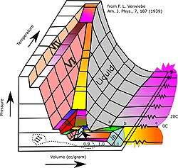 Subjected to higher pressures and varying temperatures, ice can form in nineteen separate known crystalline phases at various densities, along with hypothetical proposed phases of ice that have not been observed.[21] With care, at least fifteen of these phases (one of the known exceptions being ice X) can be recovered at ambient pressure and low temperature in metastable form.[22][23] The types are differentiated by their crystalline structure, proton ordering,[24] and density. There are also two metastable phases of ice under pressure, both fully hydrogen-disordered; these are Ice IV and Ice XII. Ice XII was discovered in 1996. In 2006, Ice XIII and Ice XIV were discovered.[25] Ices XI, XIII, and XIV are hydrogen-ordered forms of ices Ih, V, and XII respectively. In 2009, ice XV was found at extremely high pressures and −143 °C.[26] At even higher pressures, ice is predicted to become a metal; this has been variously estimated to occur at 1.55 TPa[27] or 5.62 TPa.[28]