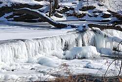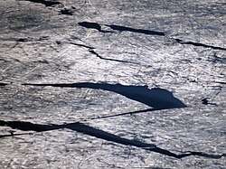 Ice forms on calm water from the shores, a thin layer spreading across the surface, and then downward. Ice on lakes is generally four types: primary, secondary, superimposed and agglomerate.[67][68] Primary ice forms first. Secondary ice forms below the primary ice in a direction parallel to the direction of the heat flow. Superimposed ice forms on top of the ice surface from rain or water which seeps up through cracks in the ice which often settles when loaded with snow. An ice shove occurs when ice movement, caused by ice expansion and/or wind action, occurs to the extent that ice pushes onto the shores of lakes, often displacing sediment that makes up the shoreline.[69]