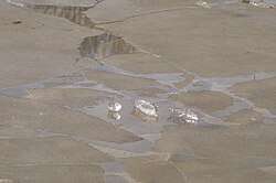 Sea ice forms in several stages. At first, small, millimeter-scale crystals accumulate on the water surface in what is known as frazil ice. As they become somewhat larger and more consistent in shape and cover, the water surface begins to look "oily" from above, so this stage is called grease ice.[50] Then, ice continues to clump together, and solidify into flat cohesive pieces known as ice floes. Ice floes are the basic building blocks of sea ice cover, and their horizontal size (defined as half of their diameter) varies dramatically, with the smallest measured in centimeters and the largest in hundreds of kilometers.[51] An area which is over 70% ice on its surface is said to be covered by pack ice.[52]
