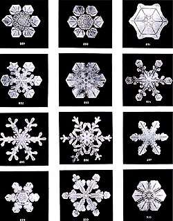 Snow crystals form when tiny supercooled cloud droplets (about 10 μm in diameter) freeze. These droplets are able to remain liquid at temperatures lower than −18 °C (255 K; 0 °F), because to freeze, a few molecules in the droplet need to get together by chance to form an arrangement similar to that in an ice lattice; then the droplet freezes around this "nucleus". Experiments show that this "homogeneous" nucleation of cloud droplets only occurs at temperatures lower than −35 °C (238 K; −31 °F).[72] In warmer clouds an aerosol particle or "ice nucleus" must be present in (or in contact with) the droplet to act as a nucleus. Our understanding of what particles make efficient ice nuclei is poor – what we do know is they are very rare compared to that cloud condensation nuclei on which liquid droplets form. Clays, desert dust and biological particles may be effective,[73] although to what extent is unclear. Artificial nuclei are used in cloud seeding.[74] The droplet then grows by condensation of water vapor onto the ice surfaces.[75]