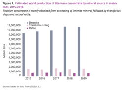 Estimated world production of titanium concentrate by mineral source in metric tons, 2015–2019. Titanium concentrate is mainly obtained from the processing of ilmenite mineral, followed by titaniferous slags and natural rutile.