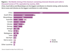 Worldwide mining of the titanium-containing minerals ilmenite and rutile in thousand tonnes of TiO2 equivalent by country, in 2020.