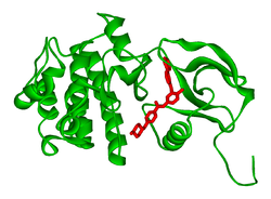 bcr-abl kinase (green), which causes CML, inhibited by imatinib (red; small molecule).